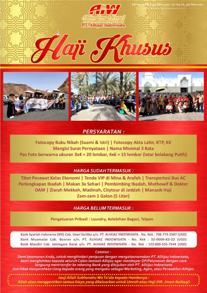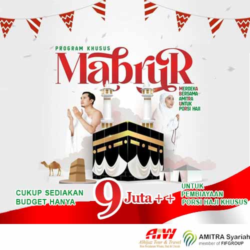 ALHIJAZ Berkerjasama dengan lembaga keuangan Syariah AMITRA melayani pembiayaan syariah unuk ambil PORSI didepan dengan cukup setor Rp. 9 Jt an. ALHAMDULILAH ini program baru dengan biaya yang relatif ringan Syarat Cukup KTP & KK. Anda Sudah Pegang PORSI Haji Khusus.
